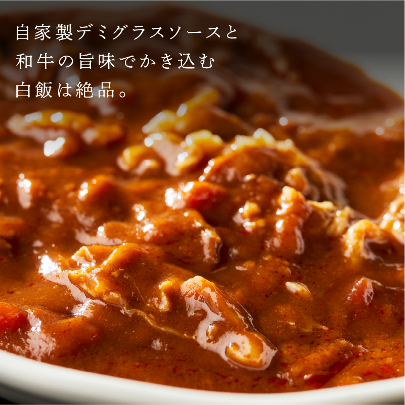ご飯との相性抜群の自家製デミグラスソースが和牛の旨味とともに、ロの中で絶妙に調和。まかないで振る舞われるには贅沢すぎる一品。一度味わえば、その虜になること間違いなし!自分への特別なご褒美やおもてなし、手土産にもおすすめの逸品です。